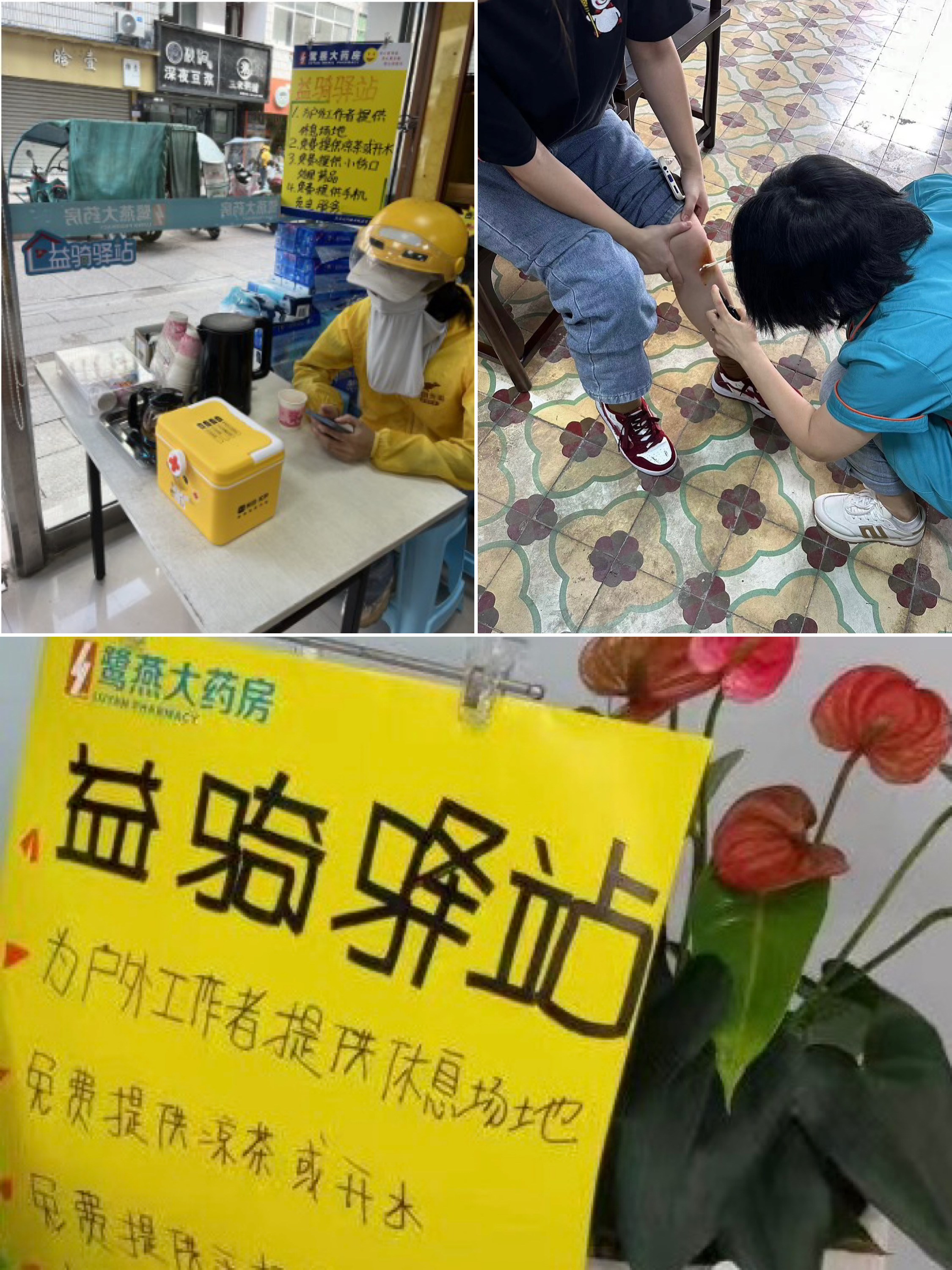 鹭燕大药房在党总支的牵头下,利用270多家门店设立了“益骑驿站”。面对酷暑时节,免费为外卖骑手、快递小哥、环卫工人等户外劳动者提供防暑药品,解决特定群体的“急难愁盼”;主动开放门店空间,为户外工作者提供免费饮水、休息和充电服务,打造传递友善互助的“暖心角”;店员们总是第一时间为门店附近突发意外受伤的群众提供基础救助和关怀,切实提升居民安全感。