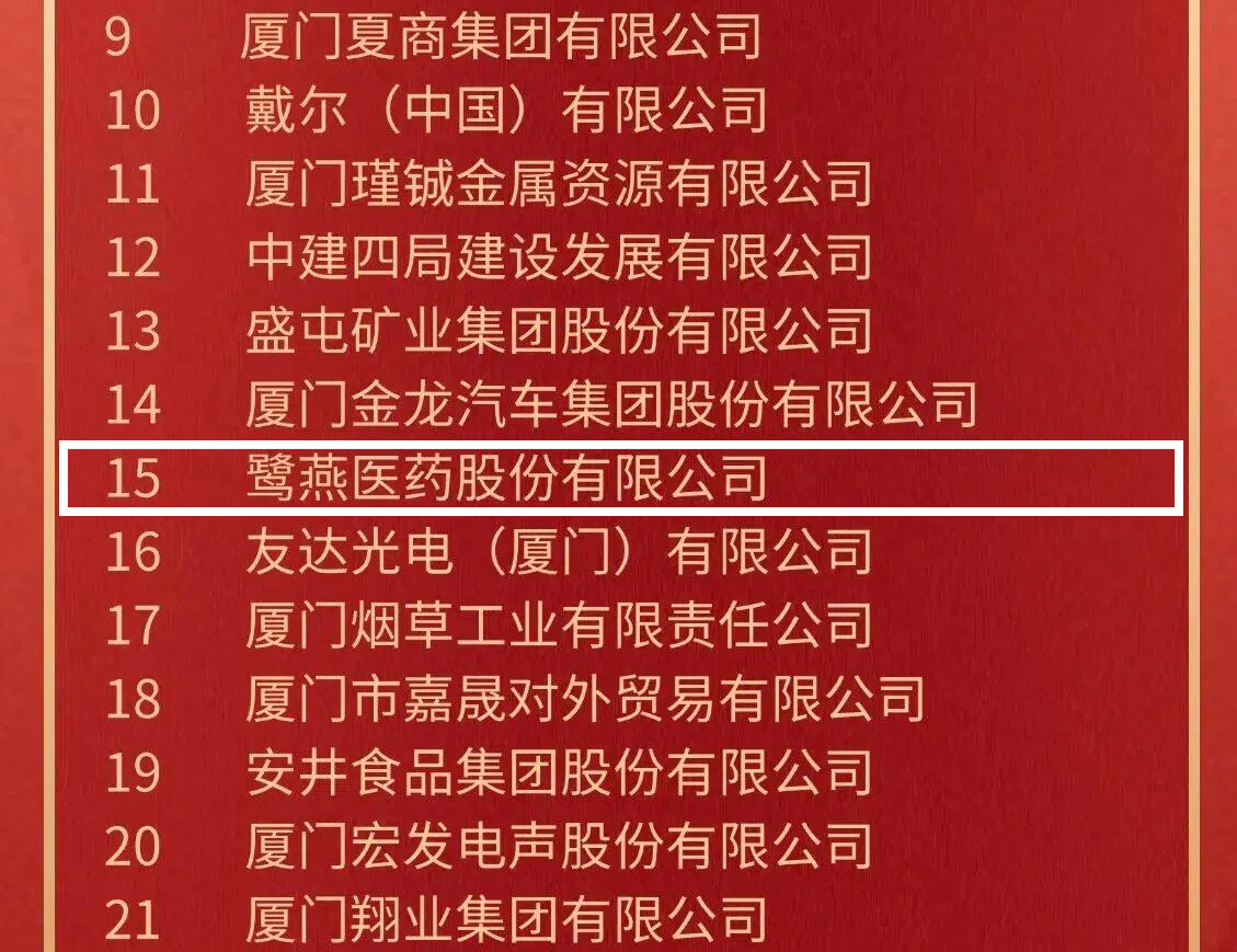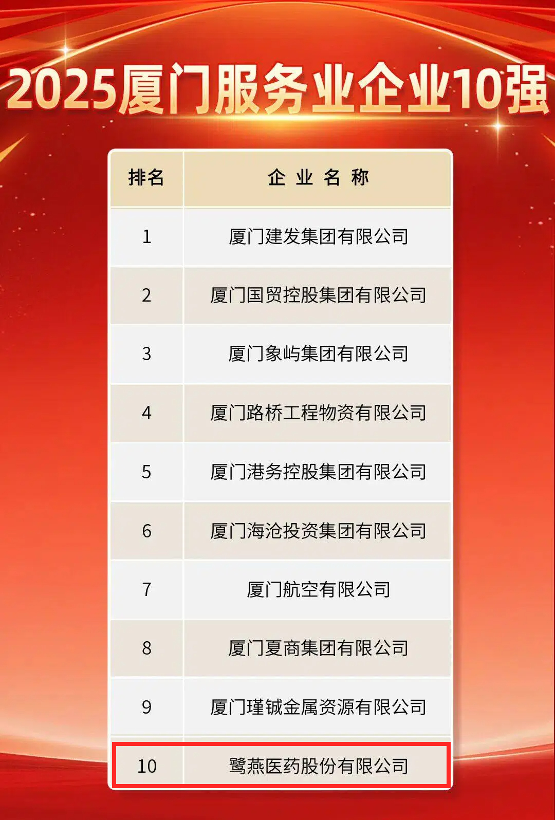 12月7日,2025厦门企业100强系列榜单正式发布。鹭燕医药荣膺“厦门企业100强”第15位,以及“厦门服务业企业10强”第10位。
