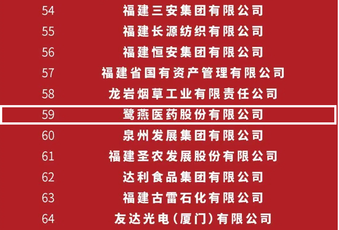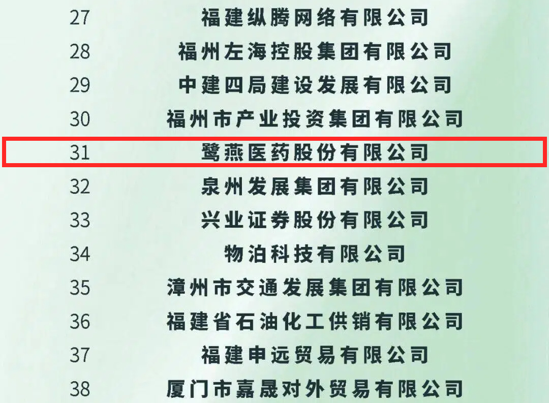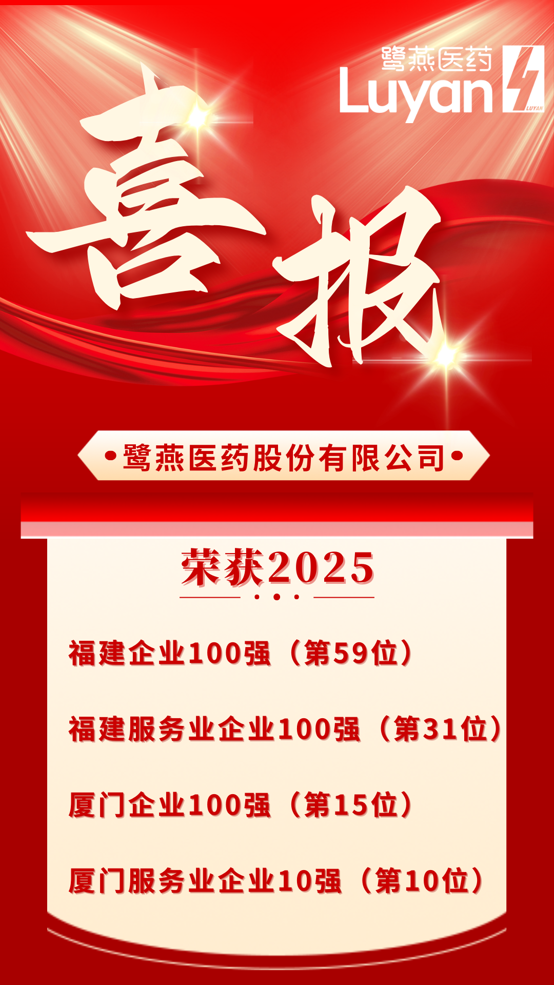 11月27日,2025福建企业100强系列榜单正式发布。鹭燕医药荣膺“2025福建企业100强”第59位,以及“2025福建服务业企业100强”第31位。